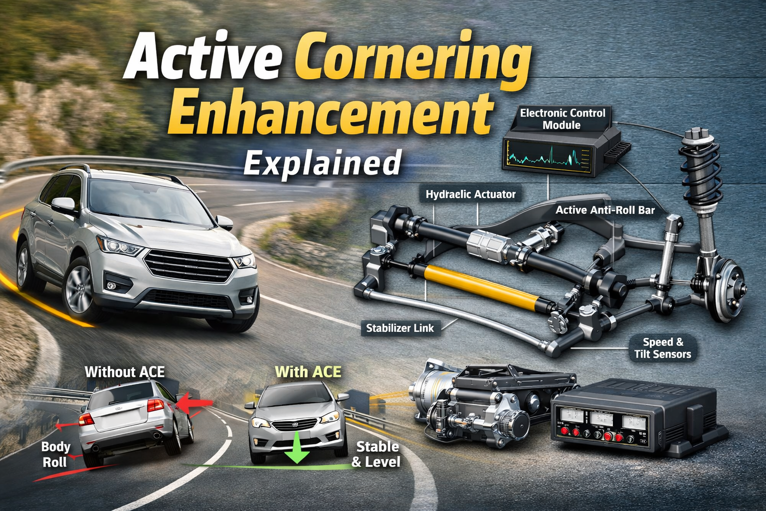 An active cornering enhancement system includes several important parts working together as one unit. These often include sensors, a control module, hydraulic or electronic actuators, and anti-roll bars or connected suspension components that respond during cornering events.